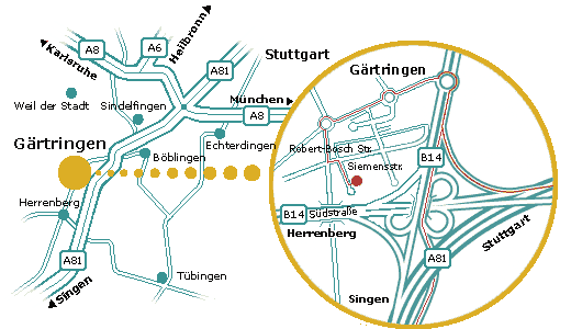 Ebenso erreichen Sie uns über die B14 aus Richtung Böblingen oder Herrenberg kommend über die gleichen Kreisverkehre.